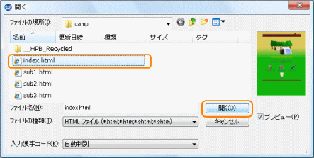 - [ファイルの場所] で、ホームページを保存しているフォルダ (トップフォルダ) が指定されていることを確認します。ファイルの一覧からトップページのファイルを選択し、[開く] ボタンをクリックします。