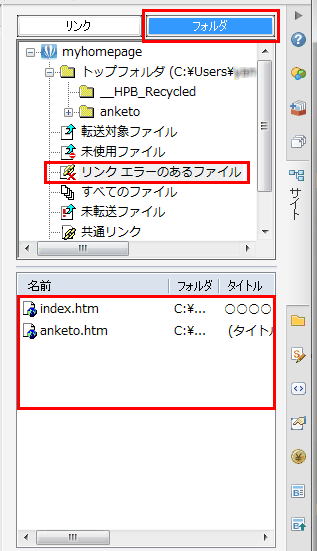 ホームページ・ビルダーでは、このような正しく動作しないリンク先を持つファイルを見つけ出すことができます。