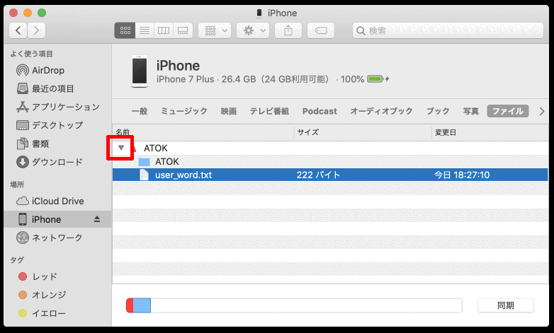 - サイドバーで接続したiPhoneやiPadを選択し、[ファイル]タブに切り替えます。